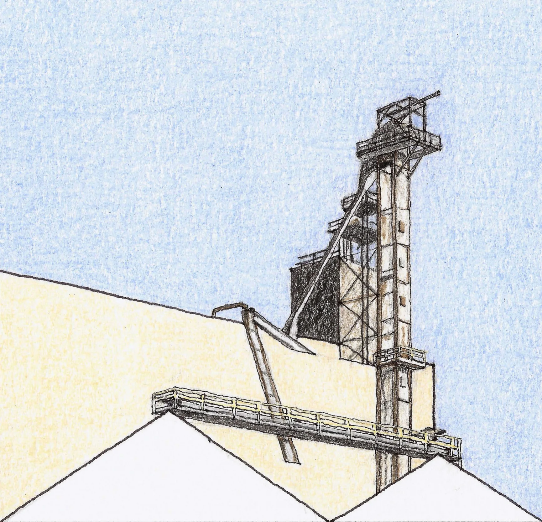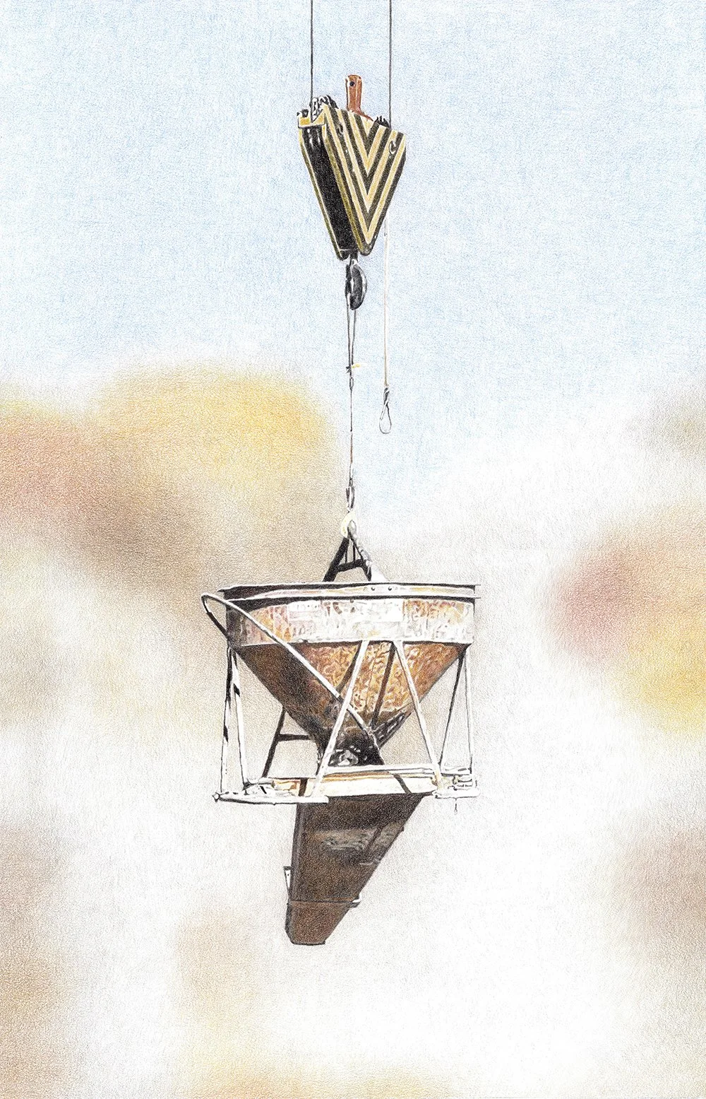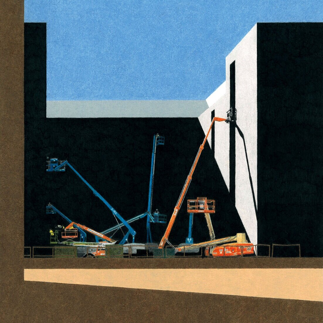 This drawing depicts a scene of a building under construction, with a stark moment of light and shadow as the focal point. In an abstracted, simplified context, the finely detailed lifts become ‘characters’ that invite the viewer to contemplate a larger narrative about building construction and the ‘mystery’ of trade work as observed by the lay person.
